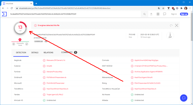 4. Por outro lado, quando vários antivírus detectam o arquivo como um malware, ele provavelmente é um arquivo malicioso e você não deve executá-lo em seu computador. No exemplo, abaixo, mais de 10 antivírus detectaram o arquivo como uma ameaça, portanto, ele realmente deve ser um vírus.