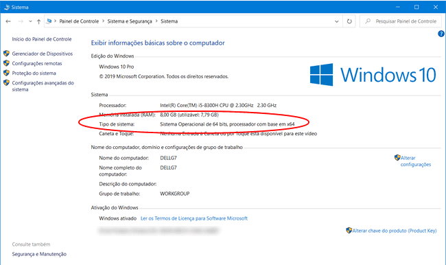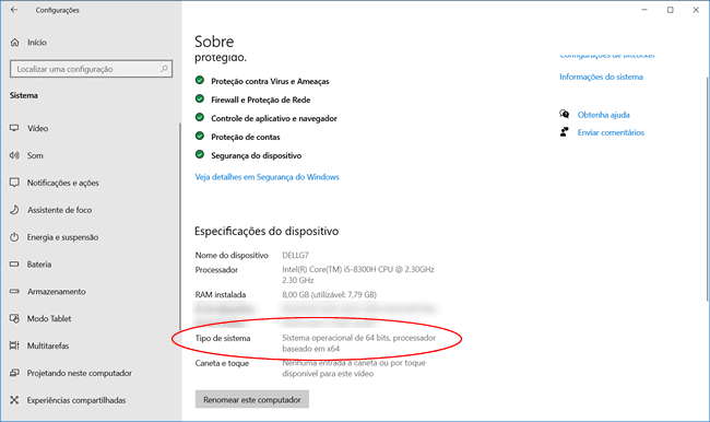 2. Clique em “Sistema e Segurança> Sistema” e verifique em “Tipo de sistema” se o Windows 10 em seu computador usa a versão de 32 ou 64 bits do sistema operacional em hardware de 32 ou 64 bits.
