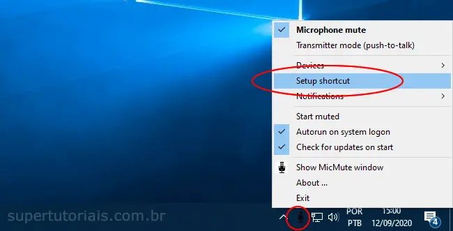 2. Uma vez executado, ele adiciona um ícone de microfone na bandeja do sistema. Quando o ícone está preto, o microfone está desligado e quando ele está vermelho, está ligado. Clique com o botão direito no ícone e selecione a opção “Setup Shortcut” para criar a tecla de atalho para ligar/desligar.