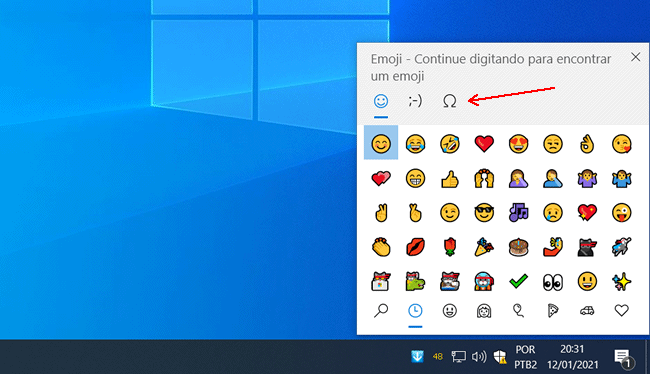 1. Pressione as teclas Windows + . (ponto) para abrir o painel de emoji. O painel é organizado em 3 categorias diferentes. Clique na terceira categoria para visualizar os símbolos disponíveis no painel.