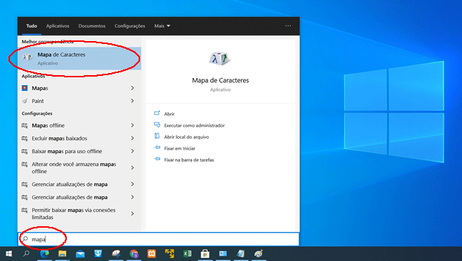 1. Abra o Menu Iniciar, pesquise por mapa e abra o “Mapa de Caracteres”.