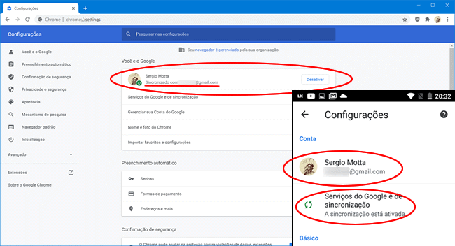 1. Primeiro, certifique-se que está usando a mesma conta do Google em ambos os dispositivos. Isso pode ser confirmado rapidamente nas “Configurações” do Chrome no computador e no smartphone.