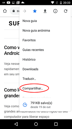 2. Uma vez verificado que você está usando a mesma conta nos dois dispositivos, para enviar uma página do celular para o computador, abra o menu do Chrome e selecione a opção “Compartilhar”.