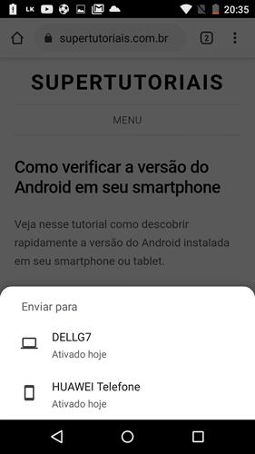 4. Por fim, ao clicar em “Enviar para seus….” ele irá mostrar todos os dispositivos que estão usando essa conta do Google. Toque no dispositivo desejado para compartilhar a página aberta no Chrome.