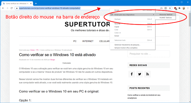 1. Enviar uma página do computador para o Chrome no celular é ainda mais simples. Com a página aberta, clique com o botão direito na barra de endereços do navegador e selecione a opção “Enviar para seus dispositivos”. Em seguida, clique no dispositivo para o qual deseja enviar a página aberta.