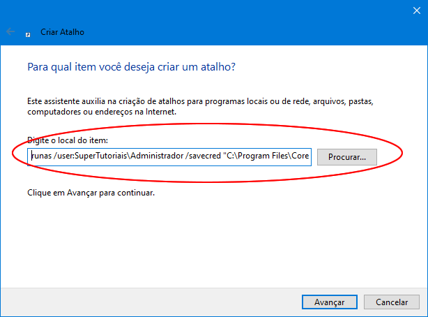 3. No campo “Digite o local do item” digite o comando abaixo trocando as informações em vermelho. Para descobrir o nome do computador, pressione “Windows + R”, digite sysdm.cpl e clique em “OK”.