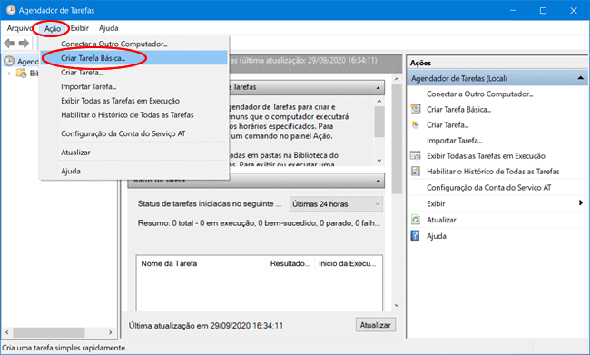 2. Uma vez aberto o Agendador de Tarefas, clique no menu “Ação > Criar Tarefa Básica”.