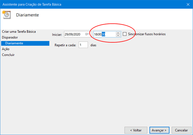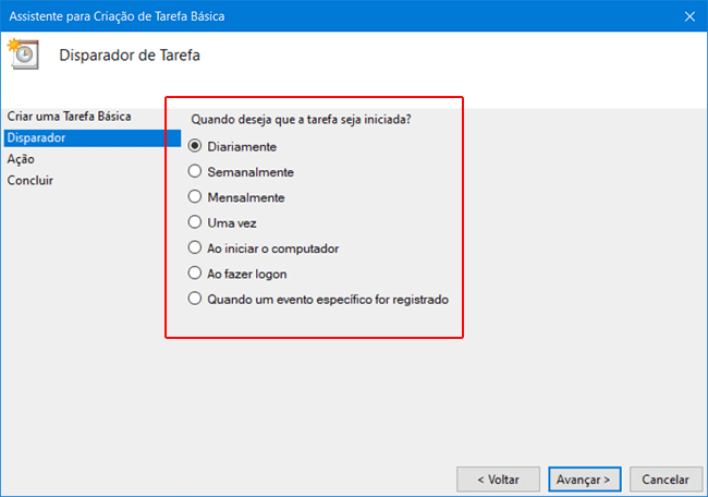 4. Em seguida, defina quando o programa deve ser executado automaticamente. Se você escolher as opções Diariamente, Semanalmente ou Mensalmente, você poderá definir os dias e os horários.