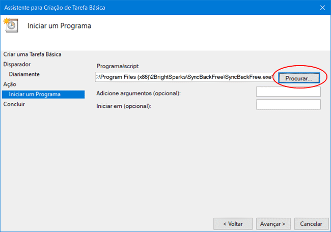 6. Clique em “Procurar” e selecione o arquivo executável (EXE) do programa. Opcionalmente, você também pode adicionar argumentos, mas se você não sabe o que é isso deixe o campo em branco.