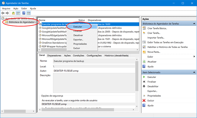 Nota: Se a tarefa não estiver sendo listada, feche e abra novamente o Agendador de Tarefas.