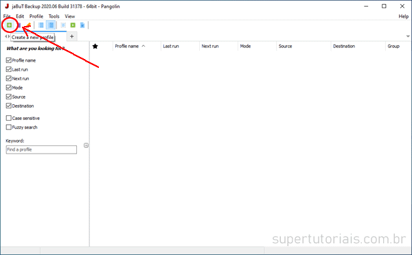 2. Uma vez instalado, abra o jaBuT Backup e clique no botão verde [+] “Create a new profile”.