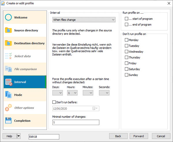 6. Agora você precisa definir quando o backup deve ser feito. Como queremos que ele seja realizado em tempo real, escolha a opção “When files change” e defina a opção “Minimal Numbers of Change” para “1”. Marque também a opçao “Force profile execution after a certain time…” para 1 hora (Hour).