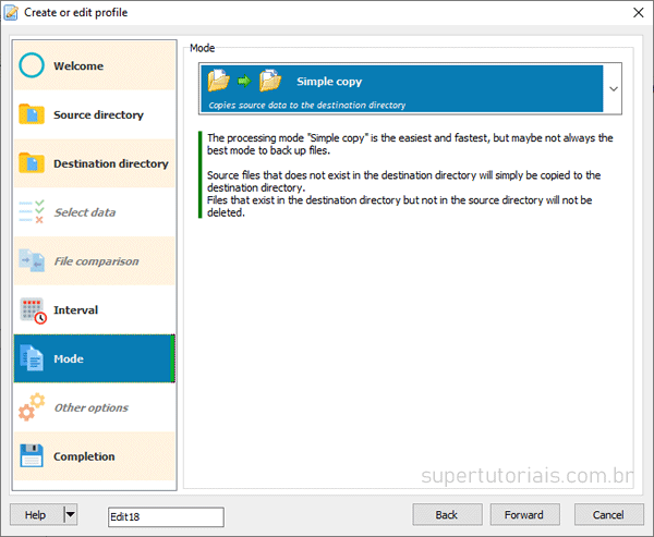 7. Na próxima etapa você precisa definir o modo de backup. Se você deseja simplesmente copiar os arquivos da pasta de origem para a pasta de destino, selecione a opção “Simple copy”, mas se você deseja manter ambas as pastas com os mesmos arquivos, você pode utilizar a opçao “Mirror Copy”.