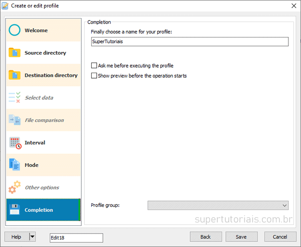 8. Por fim, digite um nome para o backup e desmarque as duas opções “Ask me before executing the profile” e “Show preview before the operation starts” para que o backup seja totalmente automático e clique em “Save” para salvar o backup. Ao fazer isso, ele ira começar a monitorar a pasta de backup.