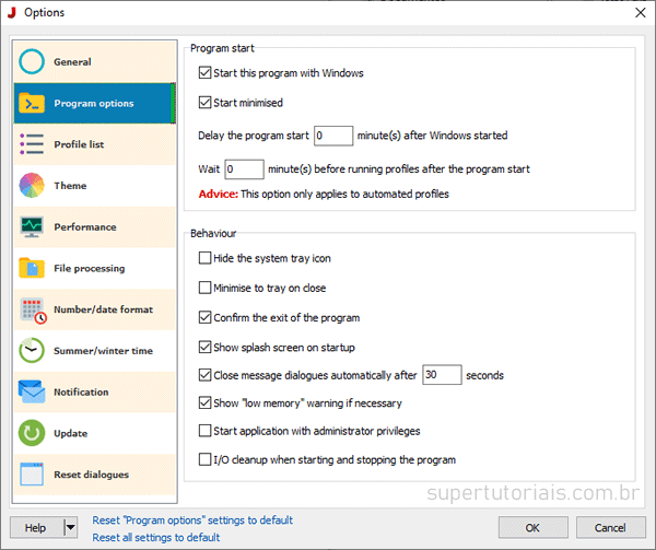 9. Por fim, para garantir que o backup seja sempre realizado, clique na opção “Edit > Settings” e, em “Program Options” marque as opções “Start this program with Windows” e “Start minimised” para ele ser sempre iniciado na inicializaçao do Windows. Pronto, feche o programa e minimize-o na bandeja.