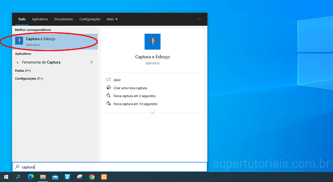 1. Pesquise por captura no Menu Iniciar do Windows 10 e selecione a opção “Captura e esboço”.