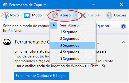 Em determinadas situações, você pode querer fazer uma captura de tela com atraso, para poder por exemplo, abrir uma janela antes de capturar a tela e usando a tecla PrintScreen, isso não é possível.