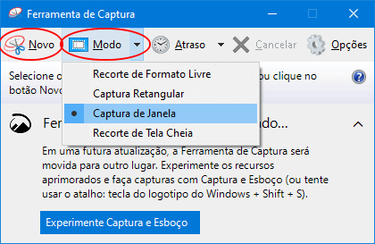 2. Clique na seta ao lado da opção “Novo” e selecione o “tipo de captura” que deseja executar. Você pode fazer a captura agora, com um atraso de 3 segundo, ou então, com um atraso de 10 segundos.
