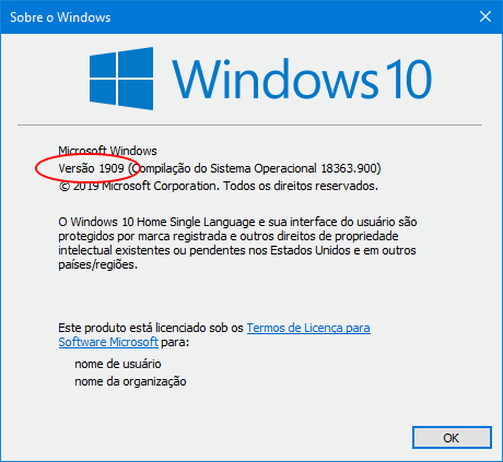 10. Para verificar se o Windows 10 foi atualizado, pressione novamente as teclas “Windows +R” para abrir o “Executar”, digite o comando winver e pressione Enter para abrir a janela “Sobre o Windows”.