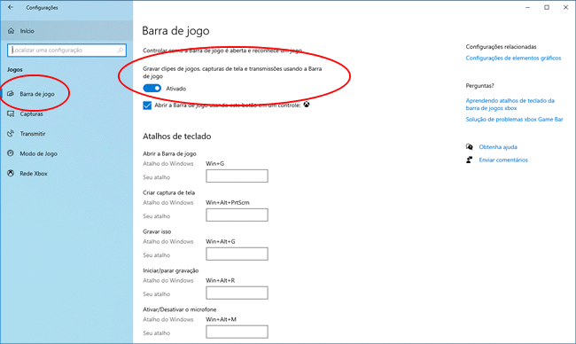 2. Na seção “Barra de Jogos”, certifique-se que a opção “Gravar clipes de jogos, captura de tela e transmissões usando barra de jogos” está ativada, caso contrário não conseguirá fazer gravações.