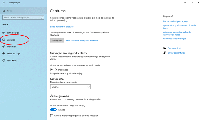 3. Na opção “Capturas” na barra lateral, você pode definir opções como a pasta onde as gravações são salvas, duração máxima da gravação, ativar a gravação de áudio, exibir ponteiro do mouse, etc.