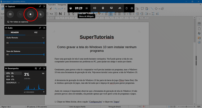 4. Com as configurações finalizadas, você está pronto para começar a gravação! Abra a janela do programa que deseja gravar, pressione Win+G para abrir a barra de jogos e clique no botão gravar.