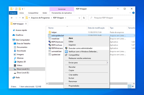 4. Clique com o botão direito no arquivo “autoupdate__enable_autorun_on_startup.bat” e selecione a opção Executar como administrador para ativar a opção de atualização automática do RDP Wrapper.