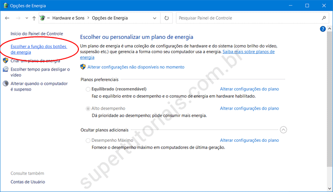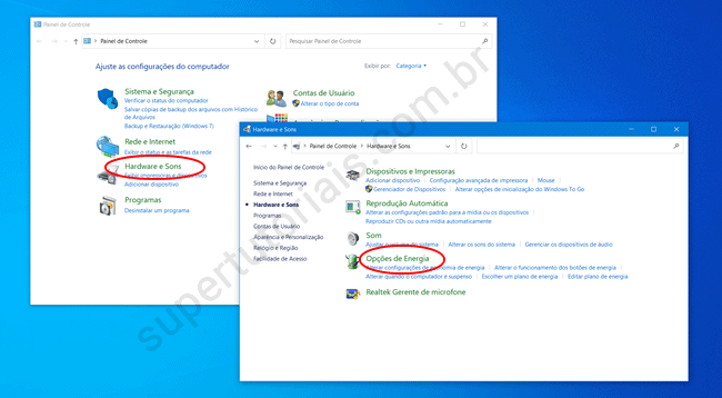 2. Clique em “Hardware e Sons” e depois em “Opções de Energia”.