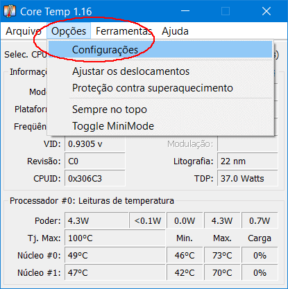 4. Para configurar o CoreTemp, clique duas vezes em um ícone de temperatura e a janela principal do programa será aberta. Clique no menu “Opções” e em seguida, selecione o item “Configurações”.
