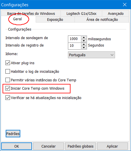 6. Por fim, na guia “Geral” marque a opção “Iniciar Core Temp com Windows” para que o programa seja iniciado automaticamente com o Windows. Clique em OK para fechar a janela de configuração.