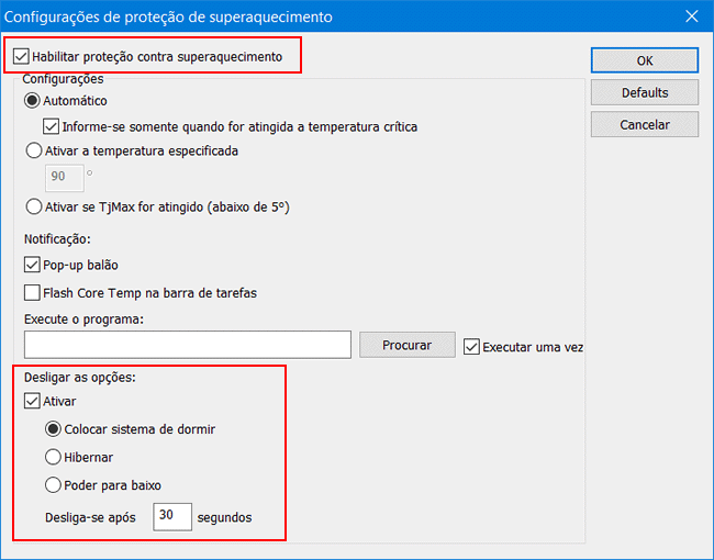 8. Na janela aberta, marque a opção “Habilitar proteção contra superaquecimento”. Aqui você pode deixar a opção automática, que usa o valor máximo suportado ou definir um valor, como “90 graus”.