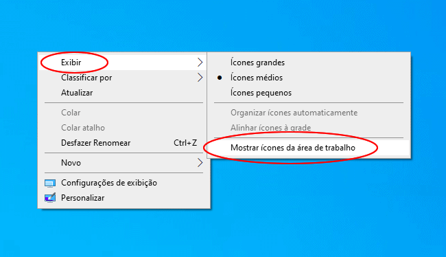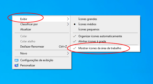 3. Para mostrar novamente os ícones da área de trabalho, clique novamente com o botão direito na área de trabalho, clique na opção “Exibir” e marque o item ”Mostrar os ícones da área de trabalho”.