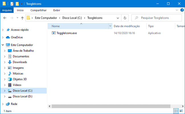 2. Copie o arquivo “ToogleIcons.exe” para uma pasta de fácil acesso, como “C:\ToogleIcons”,