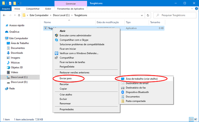 3. Clique com o botão direito no arquivo “ToogleIcons.exe” e selecione a opção “Enviar para > Área de trabalho (criar atalho). Agora você pode ocultar os ícones da área de trabalho clicando no atalho.