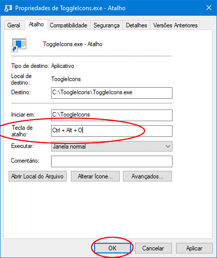 5. Defina a combinação de teclas no campo “Tecla de atalho”, como Ctrl+Alt+O e clique em “OK”.