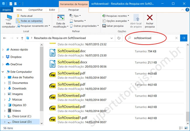 5. Uma vez feito isso ele pesquisará dentro de todos os arquivos da pasta e listará os arquivos que possuem o conteúdo pesquisado. Ele é capaz de pesquisar o conteúdo em arquivos de texto(TXT), arquivos RTF, arquivos PDF, documentos do Word, (DOC, DOCX), apresentações do PowerPoint, documentos (ODT), apresentações (ODF) e planilhas (ODS) do OpenOffice, entre outros arquivos.