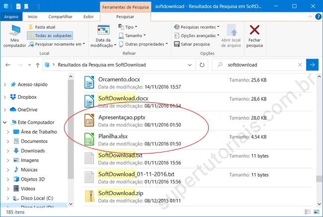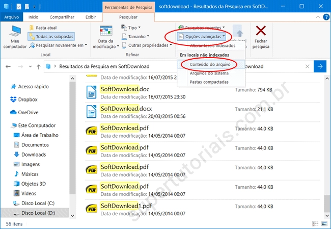 4. Uma vez feito isso, a pesquisa será atualizada e exibirá também os arquivos que contém o texto pesquisado. Ele é capaz de localizar o texto em praticamente todos os tipos de documentos, como documentos TXT, RTF e PDF, documentos do Word (DOC, DOCX), apresentações do PowerPoint, documentos (ODT), apresentações (ODF) e planilhas (ODS) do OpenOffice, entre outros arquivos.