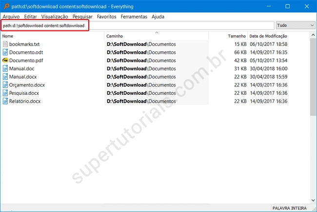 4. Agora, ele irá pesquisa apenas na pasta definida em path, mas ele ainda esta pesquisando pelo nome dos arquivos. Para pesquisar por conteúdo, acrescente content:termo que deseja pesquisar.