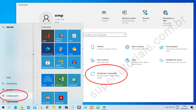 1. Abra o menu Iniciar, clique em “Configurações” e depois em “Atualização e Segurança”.