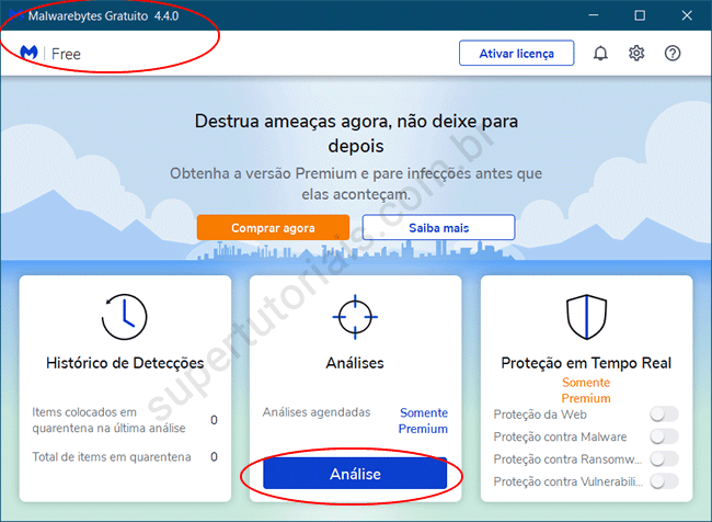 5. Uma vez feito isso, feche a janela de configuração (X), e na janela principal, clique em “Análise”, para o programa executar uma verificação completa em seu computador a procura de malwares.