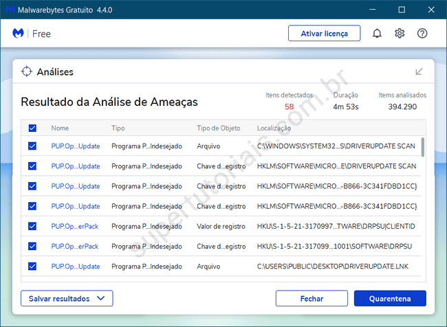 6. Aguarde a análise ser concluída. No final, ele exibe o resultado da verificação com as ameaças encontradas. Selecione todos os “malwares” que deseja remover e clique no botão “Quarentena”.