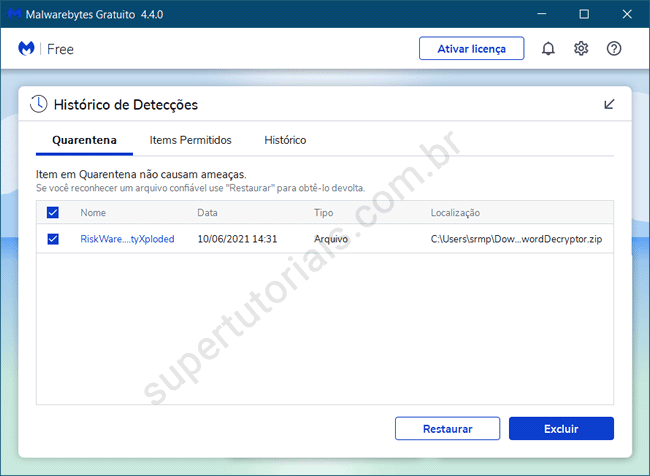7. Note que os arquivos são movidos para a “quarentena” onde ficam inativos. Se quiser realmente excluí-los, clique em “Histórico de Detecções”, selecione o que deseja apagar e clique em “Excluir”.
