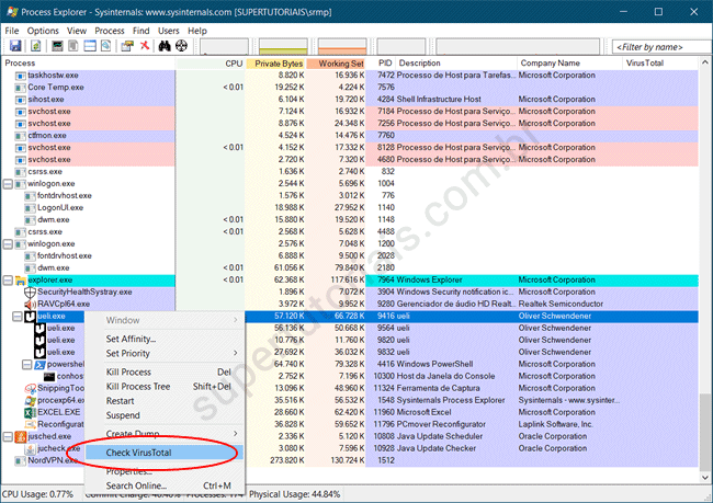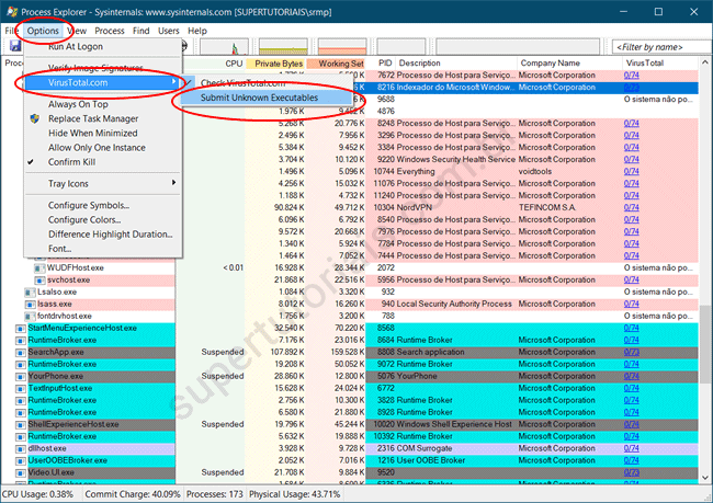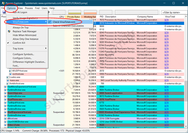 O Process Explorer é uma ferramenta usada como alternativa ao Gerenciador de Tarefas. Ele tem integração com o VirusTotal, que permite enviar processos em execução para serem examinados.
