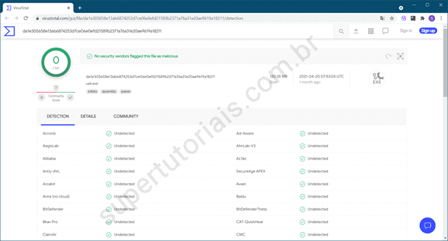 3. Se o arquivo já foi verificado anteriormente pelo VirusTotal, o resultado da analise anterior será exibido na coluna “VirusTotal”. Clique no resultado para abrir o relatório completo no VirusTotal.
