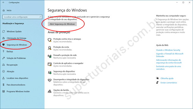 2. Clique em “Segurança do Windows” na barra lateral e depois “Abrir segurança do Windows”.