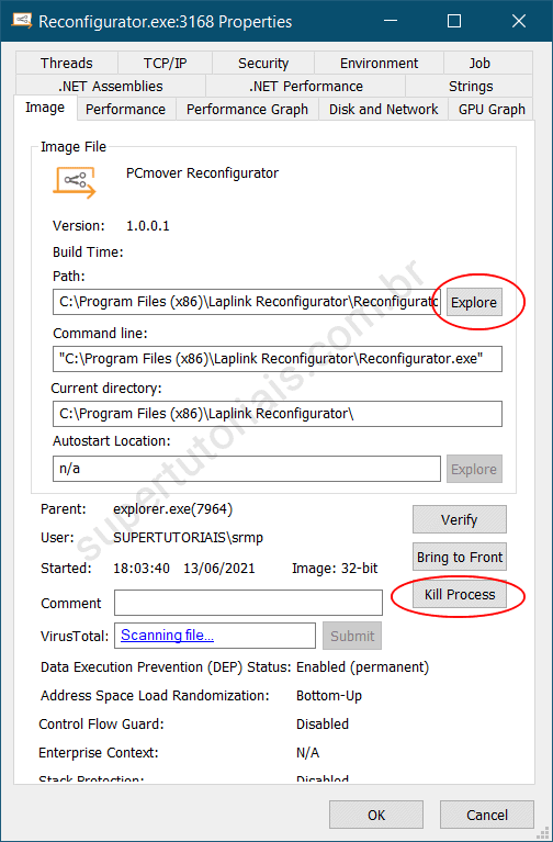 Clique com o botão direito no “programa” e abra a janela de “Propriedades”. Em seguida, clique em “Kill Process” para fechá-lo e por último, abra a pasta do programa clicando no botão “Explore” do campo “Path” e delete o “arquivo .exe” pressionando “Shift +Del” para deletá-lo de forma definitiva.