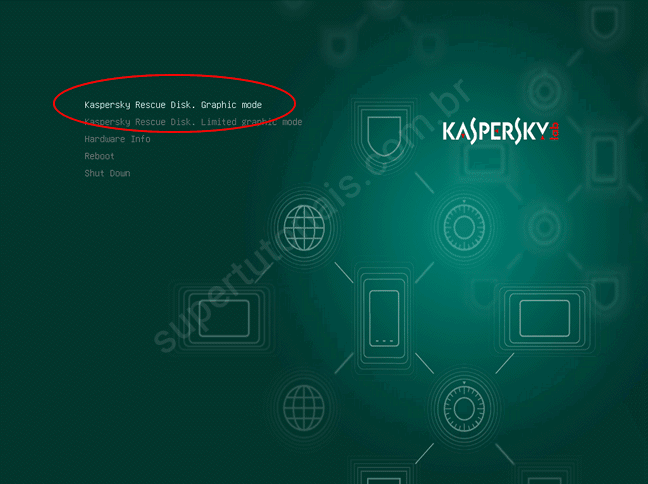 3. Uma vez iniciado o Kaspersky Rescue Disk for, selecione um idioma e em seguida, selecione a opção “Kaspersky Rescue Disk Grapich Mode” para abrir o modo gráfico do disco de recuperação.