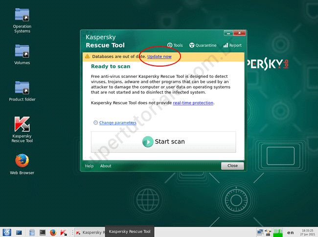 4. Aceite o contrato e aguarde o Kaspersky Rescue Disk ser inicializado. Clique em “Update Now” para atualizar a base de dados de malwares do Kaspersky. Se necessário, configure uma conexão de rede no “Menu Iniciar > Settings > Network Connections”. Ele suporta conexões a cabo e Wi-Fi.