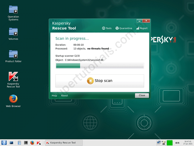 5. Após atualizar ou não a base de dados, aceite novamente o contrato para carregar o Kaspersky Rescue Tool e clique no botão “Start Scan” para realizar a verificação da unidade C do computador.