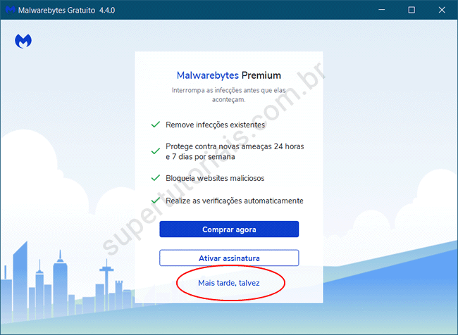 2. Execute o programa, quando for exibida a tela abaixo, clique em “Mais tarde, talvez” para usar a versão gratuita, que permite iniciar a verificação manualmente e remover os malwares encontrados.